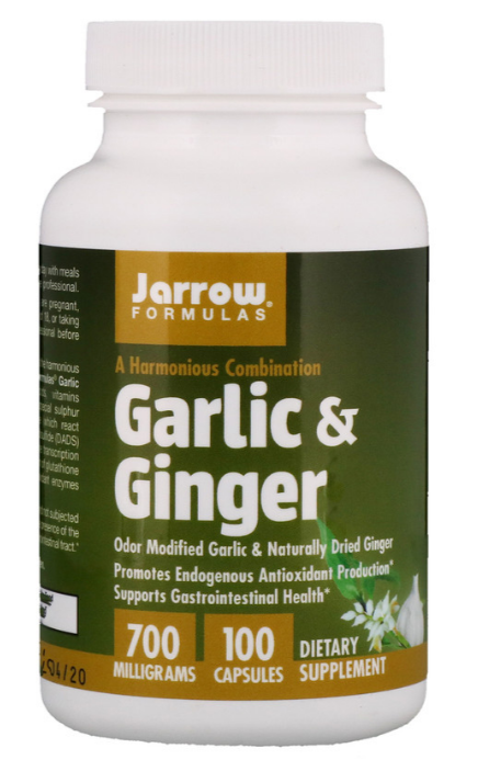 Jarrow Formulas® Garlic & Ginger содержит гармоничное сочетание чеснока и имбиря. Чеснок Jarrow Formulas содержит природные аминокислоты, витамины и минералы, в том числе селен, и специальные соединения серы, такие как аллиин и аллииназа (которые реагируют при приеме пищи с образованием аллицина) и соединения диаллилдисульфида (DADS). Аллицин и DADS активируют фактор транскрипции Nrf2, который способствует выработке глутатион-S-трансферазы и других эндогенных антиоксидантных ферментов, участвующих в фазе детоксикации печени II фазы.